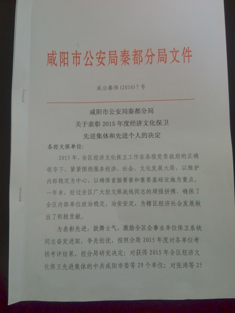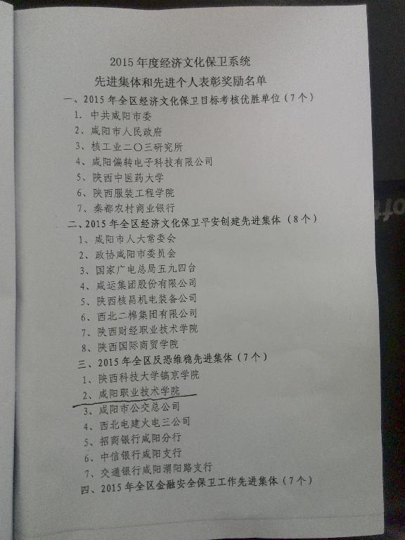 4月12日下午,秦都公安分局对2015年度经文保系统先进集体和先进个人进行表彰。咸阳职业技术学院荣获“先进集体”称号,学院党宏远、翁富乾两同志荣获“先进个人”。