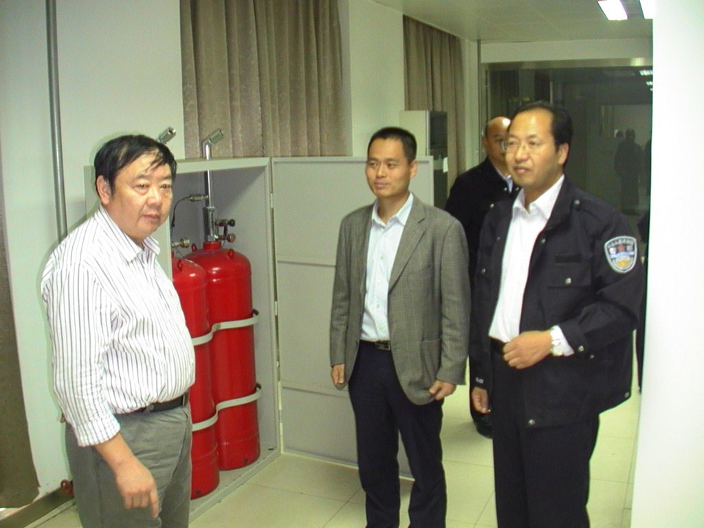 在图书馆,检查人员汇报一楼中心机房灭火设备压力不够,存在一定安全隐患,梁书记即刻指示打报告,申请冲压并补充七氟丙烷,确保主控机房设备和馆藏图书安全。