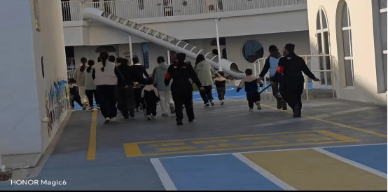 演练模拟了幼儿园放学时段一名“歹徒”持刀企图强行闯入接童区的突发场景。事件发生后,护童保安立即上前阻拦周旋,其他人员迅速启动应急程序:鸣响警笛、上报险情、组织师生紧急撤回教室并紧闭门窗防护。学院保卫处接报后,迅速调集巡逻队赶赴现场,并通知驻校民警。各方力量协同作战,最终迅速将“歹徒”制服并带离。安全撤离至教室后,老师们将幼儿隐蔽在安全区域,并对受到惊吓的孩子进行悉心安抚。